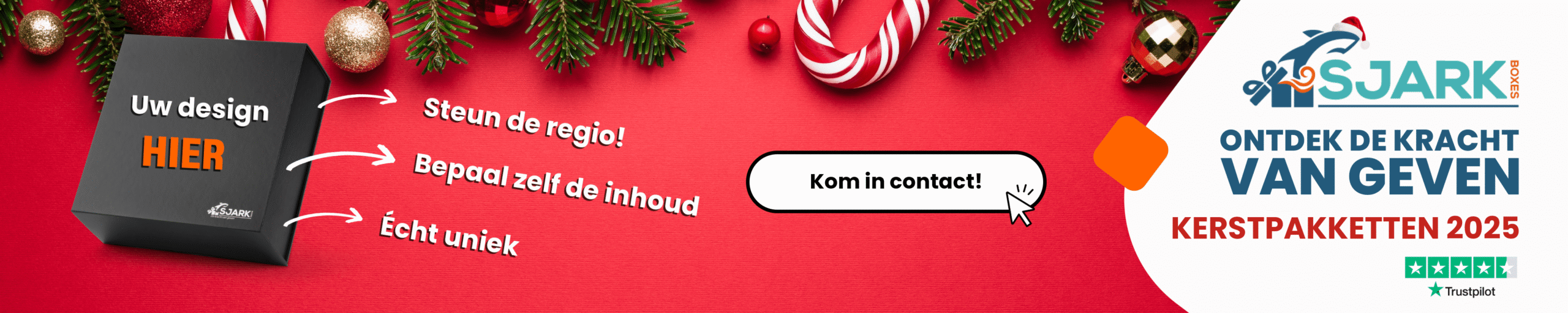 Bij Sjark Boxes geloven we dat kerst dé tijd is om samen te genieten en te verrassen. Daarom bieden wij op maat gemaakte kerstpakketten, perfect afgestemd op jouw wensen. Of het nu gaat om een feestelijke traktatie voor medewerkers, een luxe relatiegeschenk of een warme kerstverrassing, wij zorgen ervoor dat elk pakket perfect aansluit bij jouw doelgroep. Voeg een vleugje magie toe aan de feestdagen met onze unieke en sfeervolle kerstboxen! 🎄✨
